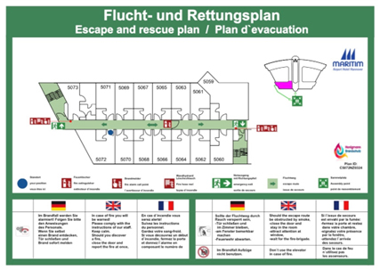 Flucht- und Rettungspläne informieren Besucher und Nutzer beim Betreten des Gebäudes, über Flucht- und Rettungswege, Erste-Hilfe-Einrichtungen und brandschutztechnische Einrichtungen für die Selbsthilfe. Sie beinhalten weiterhin Regeln über das Verhalten im Brandfall und bei Unfällen.